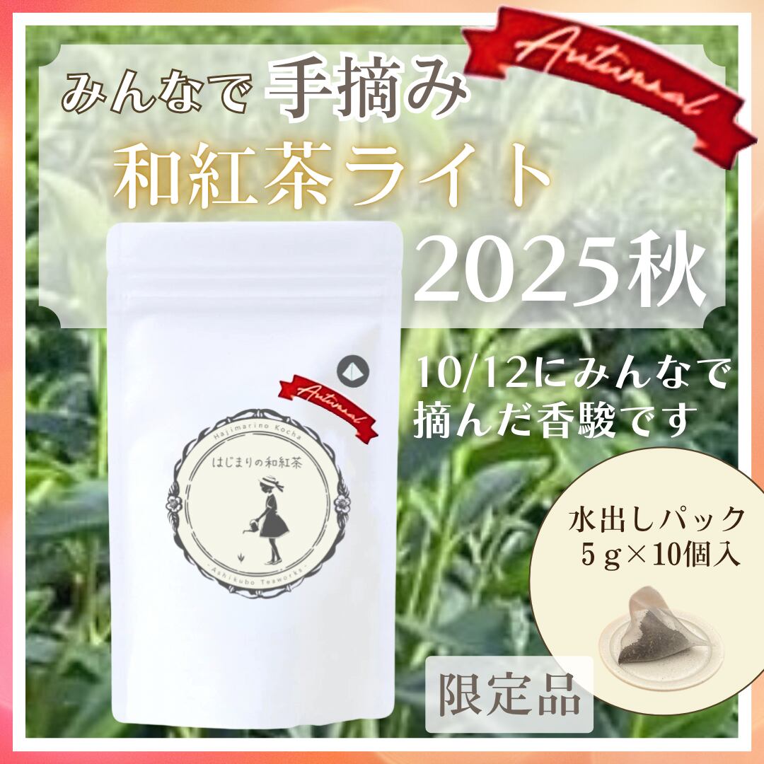 10/12のお茶摘みで〈つゆひかり〉という品種の茶の木から一芽一芽ていねいに手摘みして作った特別な和紅茶ライトです。