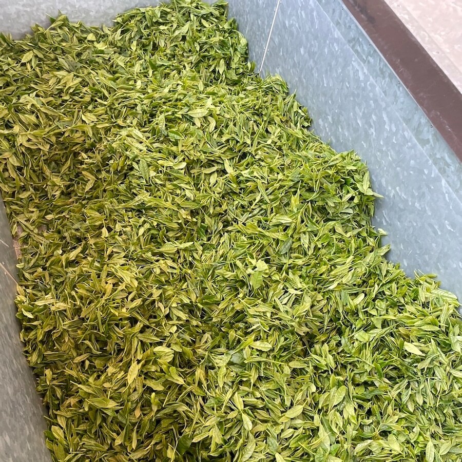 繊細な茶葉の〈くらさわ〉の持つフルーティーで上品な香りを、一晩じっくり萎凋(いちょう・しおれ)させて引き出し、さっと蒸して浅蒸し茶に仕上げていきます。