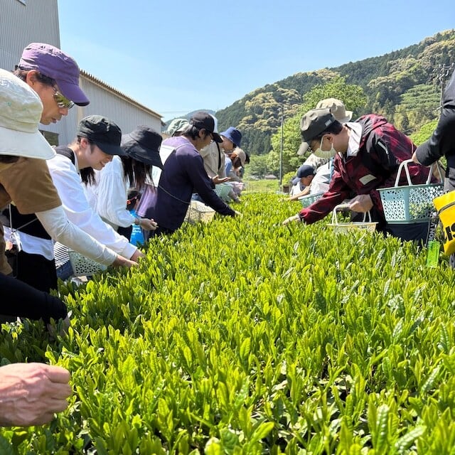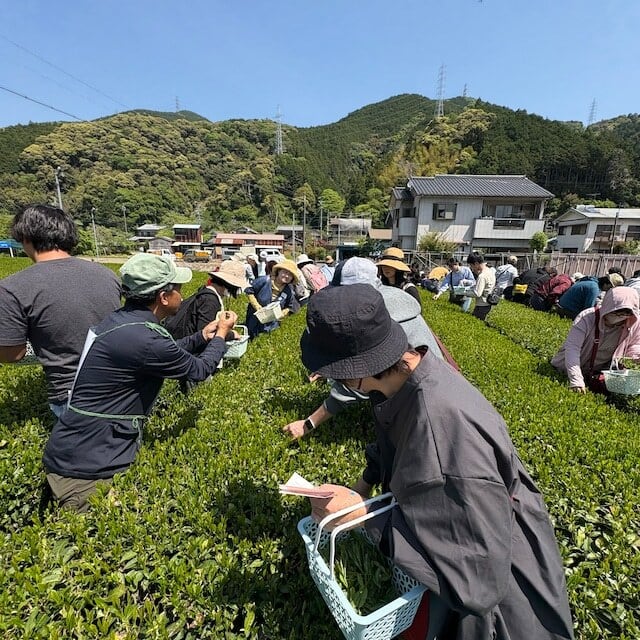 静岡県内外からお茶摘みに参加した160名以上のみなさんと、一芽一芽ていねいに手摘みをしました!